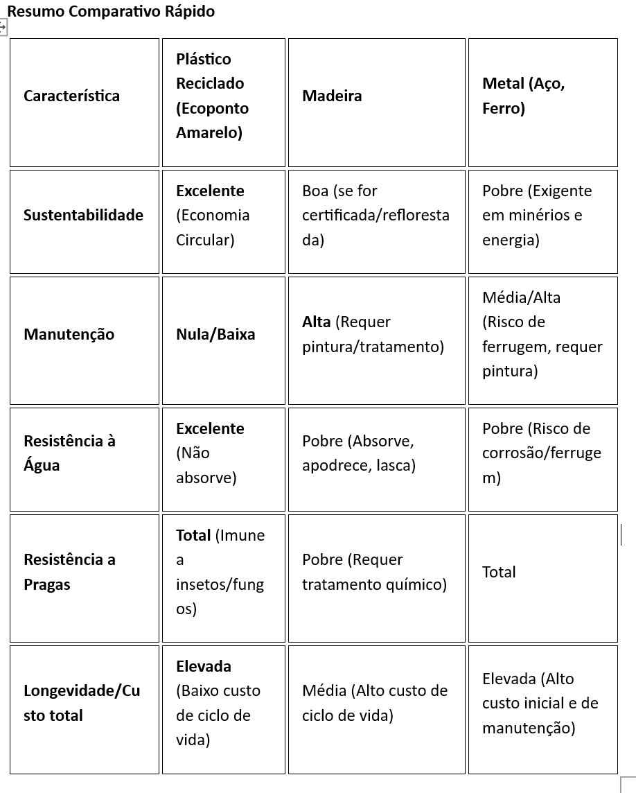 - Não Corrosivo: Ao contrário do metal (ferro), o plástico reciclado não enferruja (não sofre corrosão), mantendo a sua integridade estrutural por muito mais tempo, mesmo em ambientes agressivos (como áreas costeiras).